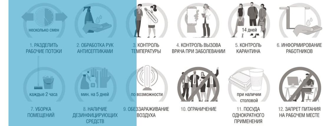 1. Разделить рабочие потоки, разместить сотрудников на разных этажах и в отдельных кабинетах, организовать работу в несколько смен.